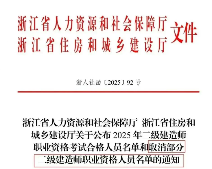 近日,浙江省人力資源和社會(huì)保障廳、浙江省住房和城鄉(xiāng)建設(shè)廳聯(lián)合發(fā)布《關(guān)于公布2025年二級(jí)建造師職業(yè)資格考試合格人員名單和取消部分二級(jí)建造師職業(yè)資格人員名單的通知》(浙人社函 [2025] 92號(hào)),明確對(duì)2022、2023、2024三個(gè)年度的189名二級(jí)建造師考生作出處理——取消考試成績(jī)、收回已發(fā)證書。