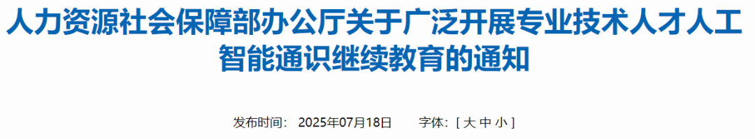 最近,人社部在官網發布了一則《關于廣泛開展專業技術人才人工智能通識繼續教育的通知》,要求全體專業技術人員開展人工智能通識繼續教育。